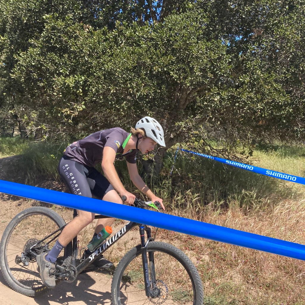 I finally settled behind a Piedmont kid and eased off the gas and followed his pace. At the top of a downhill, I heard one of the Course Marshals mutter, “Here comes 3 and 4.” Now that really got my attention, my goal was at the tip of my fingers on the first lap! At ¾ of the lap, there was a long, flat, open straight that I knew was my chance to overtake and try and catch second place, which at the time I thought was Theo. I channeled energy and tried to break away from the Piedmont kid, since I knew if I relaxed and let him follow close behind it’d turn into a battle, and that wasn’t what I wanted especially since I was already a little gassed from making up thirty spots. I crossed the line with my legs burning and lungs working hard, but I knew I could sustain at least my current pace for the next lap. I spent the second lap half recovering and half trying to find P2. Coach Doug appeared course-side and told me there was 30 seconds to P2, and about 2 minutes to the leader. So I wasn’t too close, but I also hadn’t seen a single soul behind me for the whole lap. The third lap started out like the second, until I glimpsed and saw a rider hauling toward me on one of the early straights. He passed me on the climb and I was kicking myself to fight back, but I noticed his race plate was a different color. I yelled at him, “Hey are you D2?”. He responded “Yeah”, and I could breathe again.